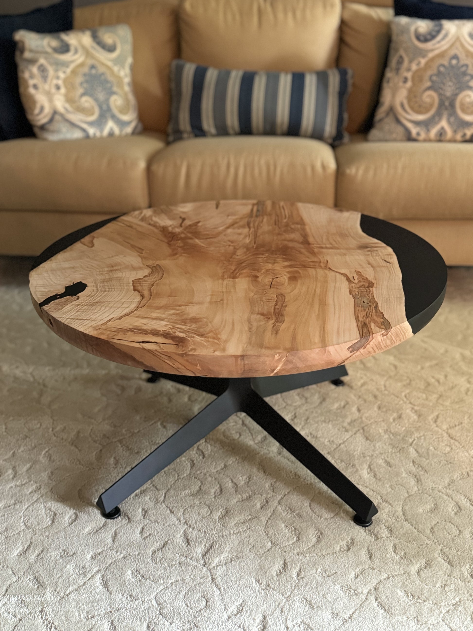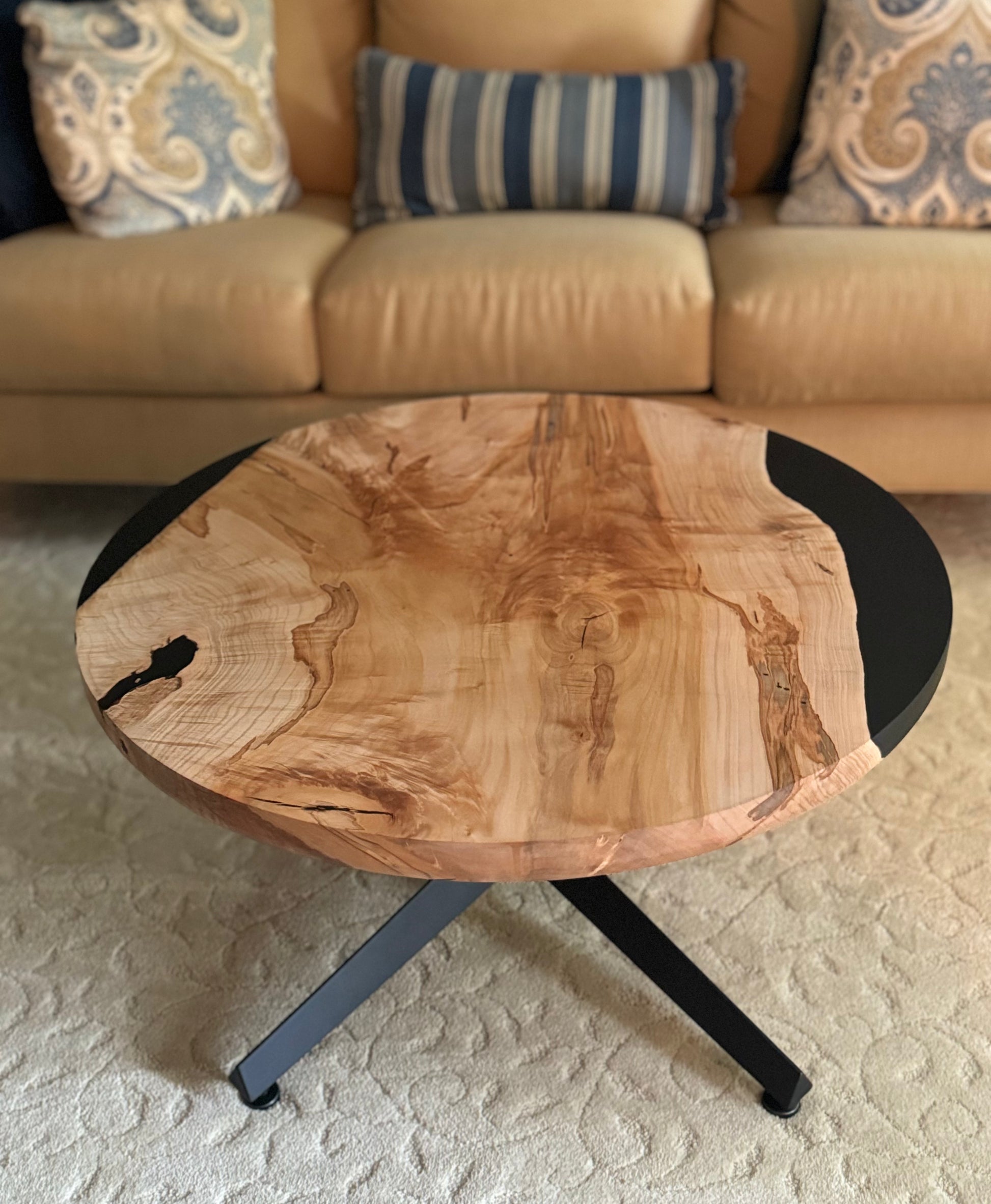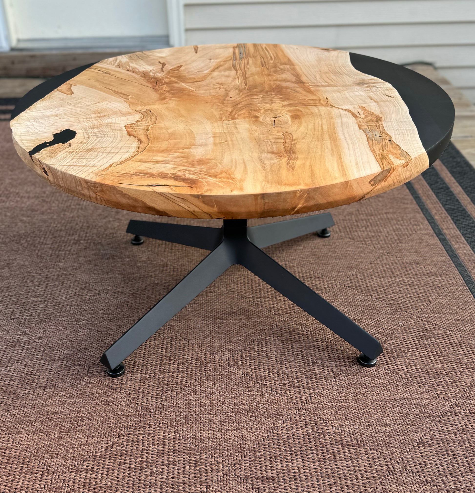 Experience the epitome of craftsmanship with our Ambrosia Maple and Deep Black Epoxy coffee table, a stunning centerpiece measuring 32” in diameter and standing 18” tall. The tabletop boasts a substantial 2” thickness, adorned with a distinctive 22.5-degree bevel along its lower edge, enhancing both aesthetic appeal and tactile experience.