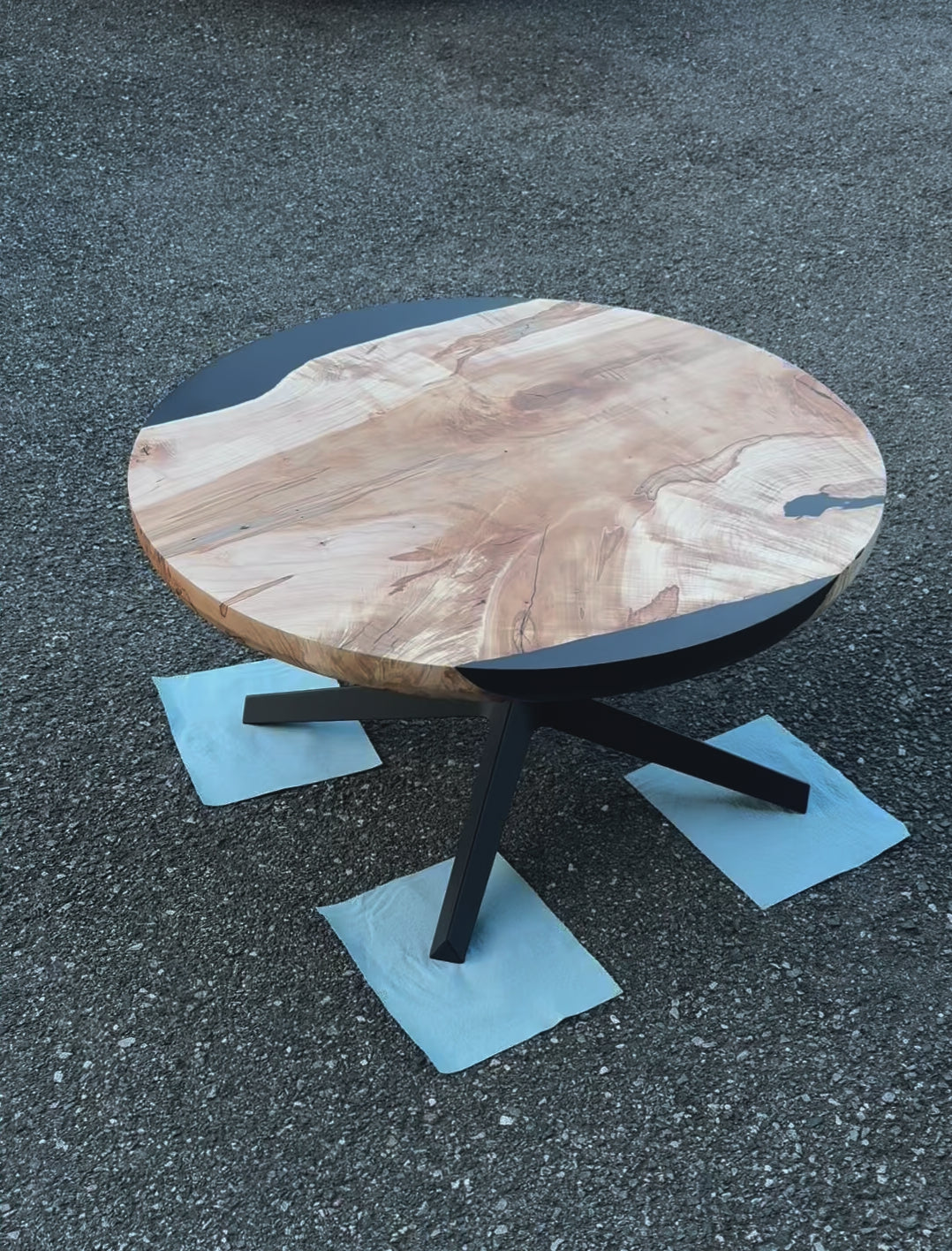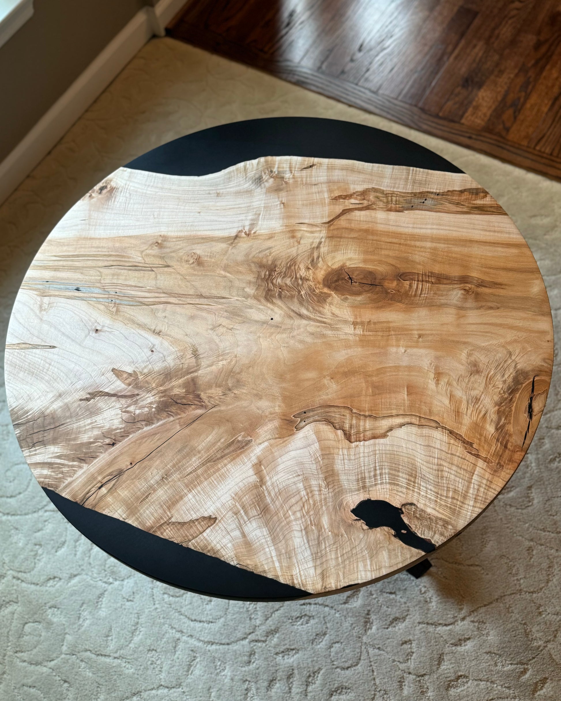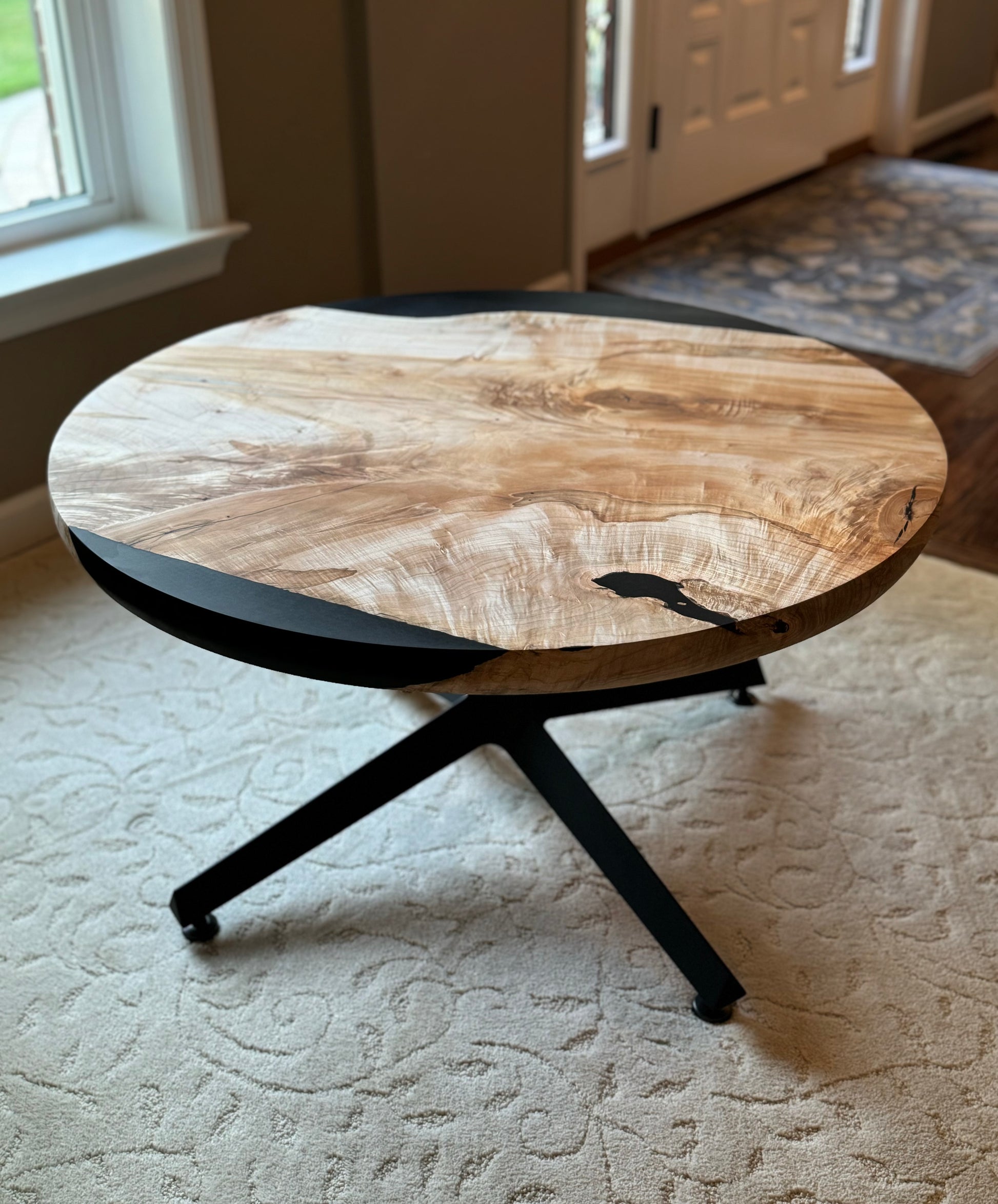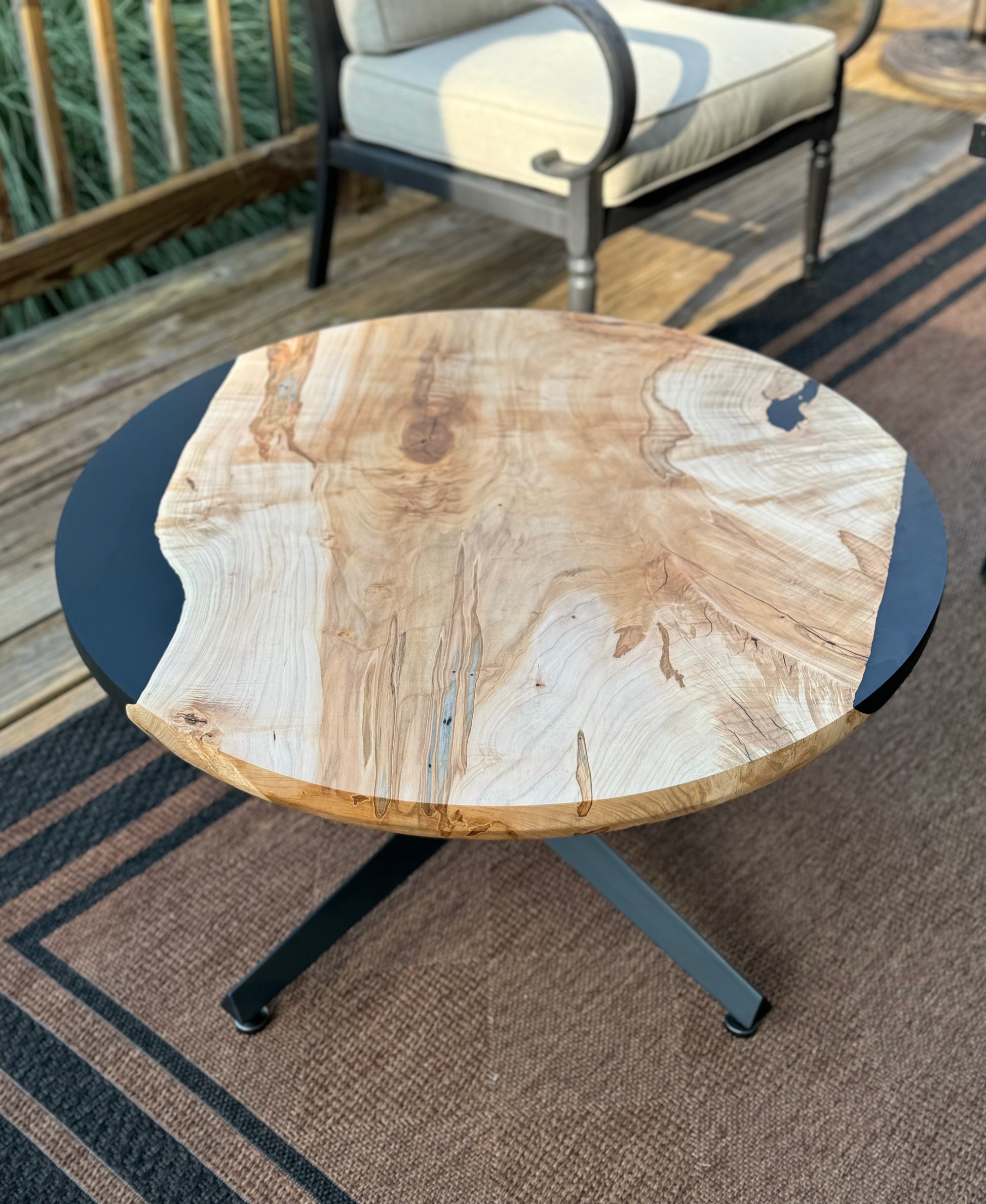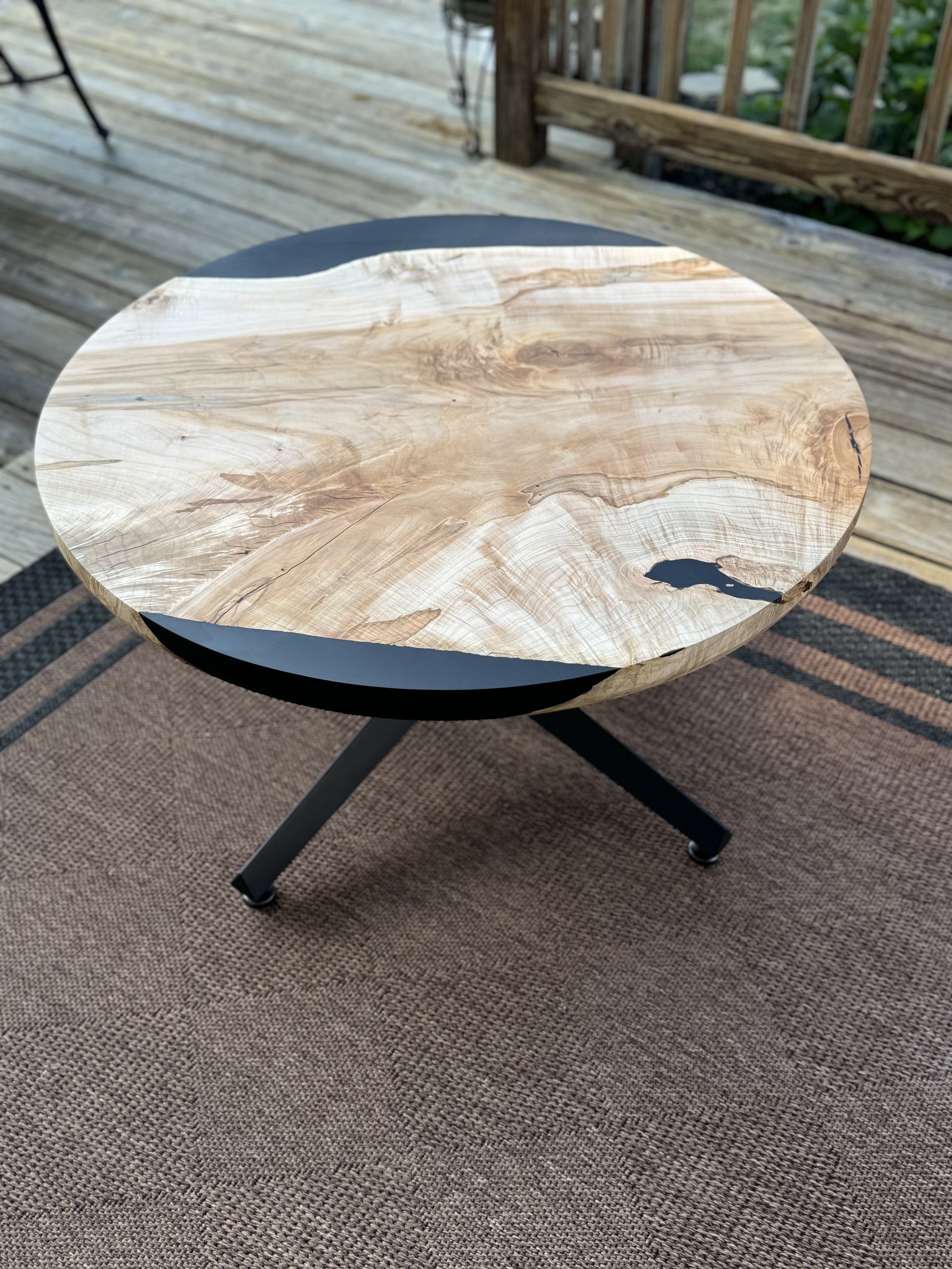 Highlighted by a mesmerizing blend of deep black epoxy seamlessly melded with Ambrosia Maple's natural wood grain, each piece is a testament to artistry. The maple wood features captivating curly patterns that captivate the eye, ensuring each table is unique in its beauty.