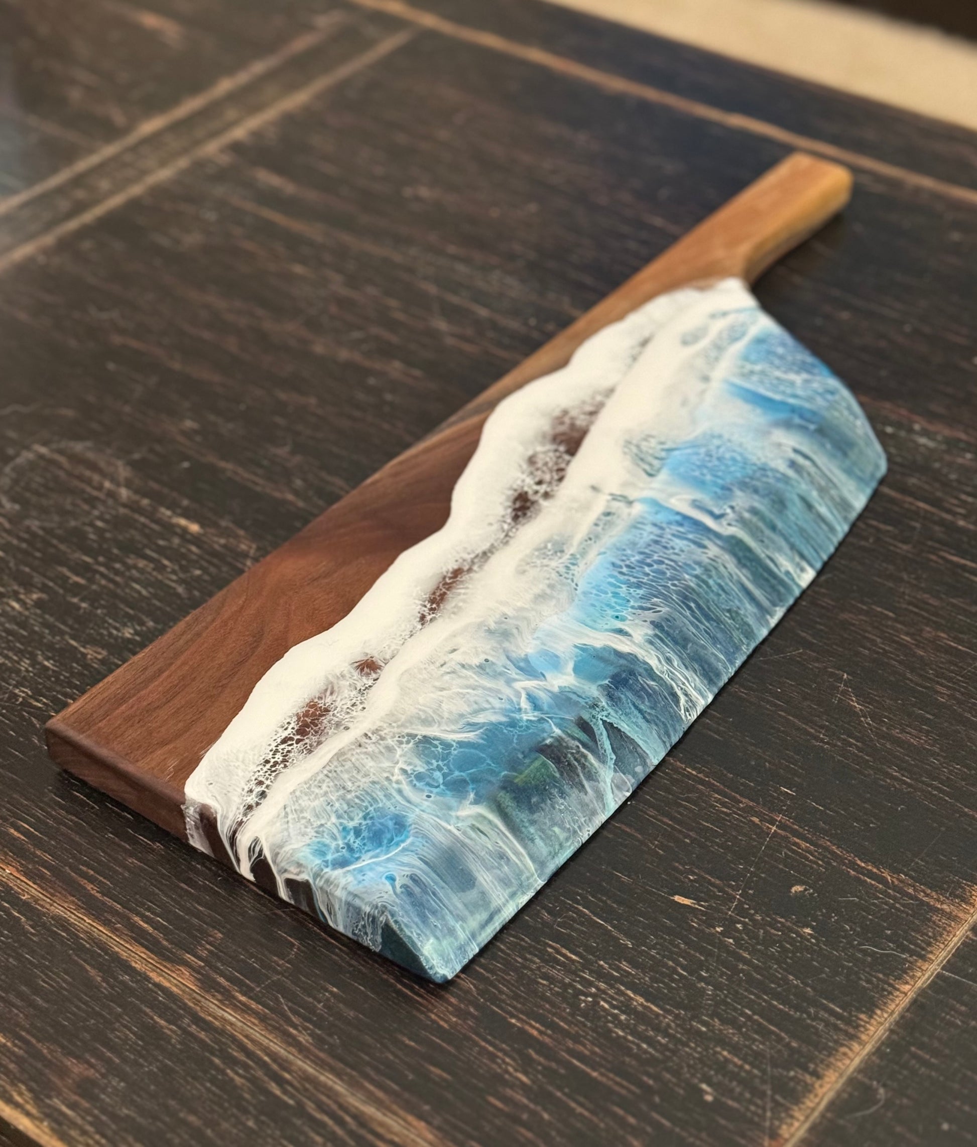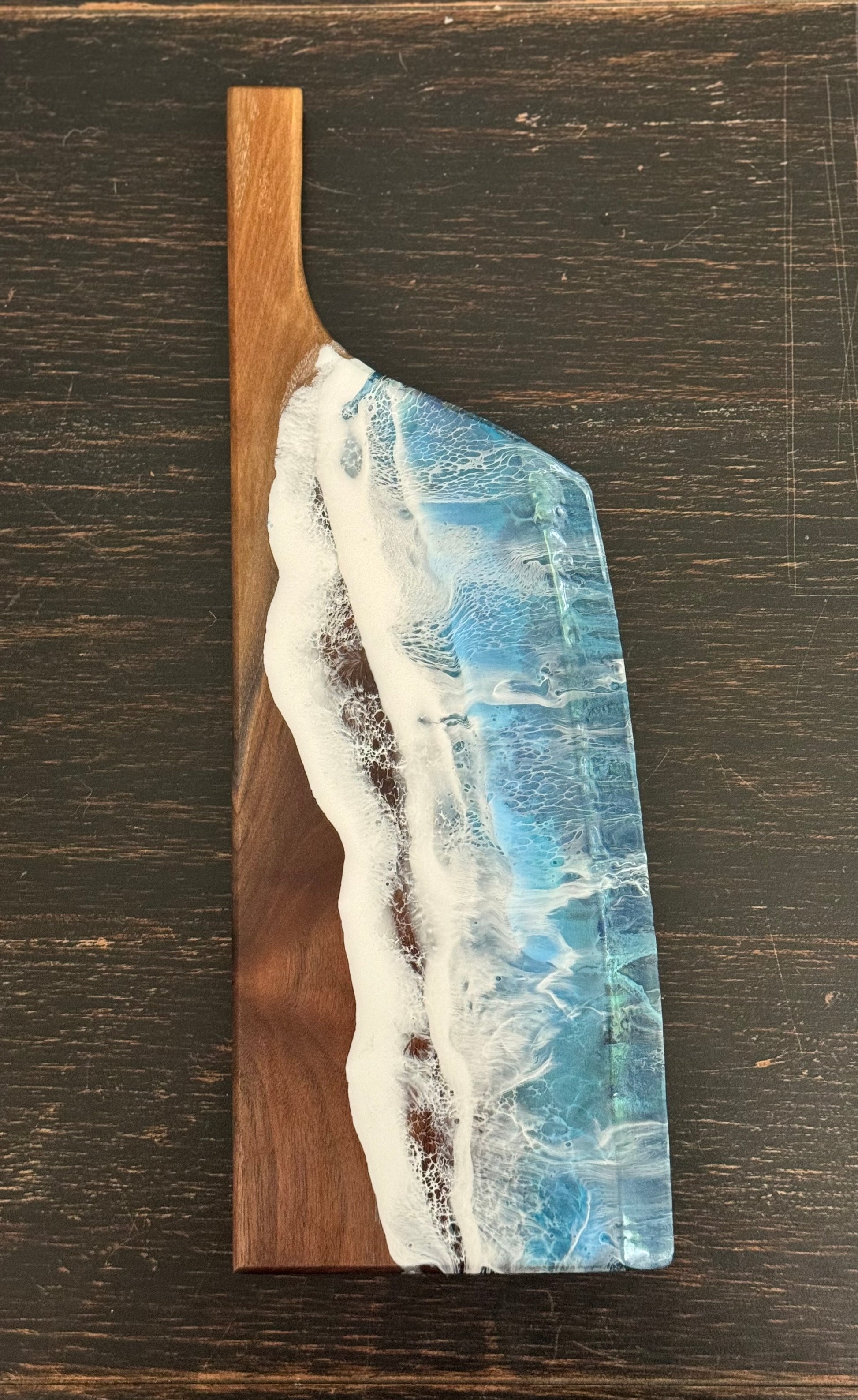 Black Walnut clever style charcuterie board with beautiful ocean wave epoxy detail. 18” long 6-7” wide.