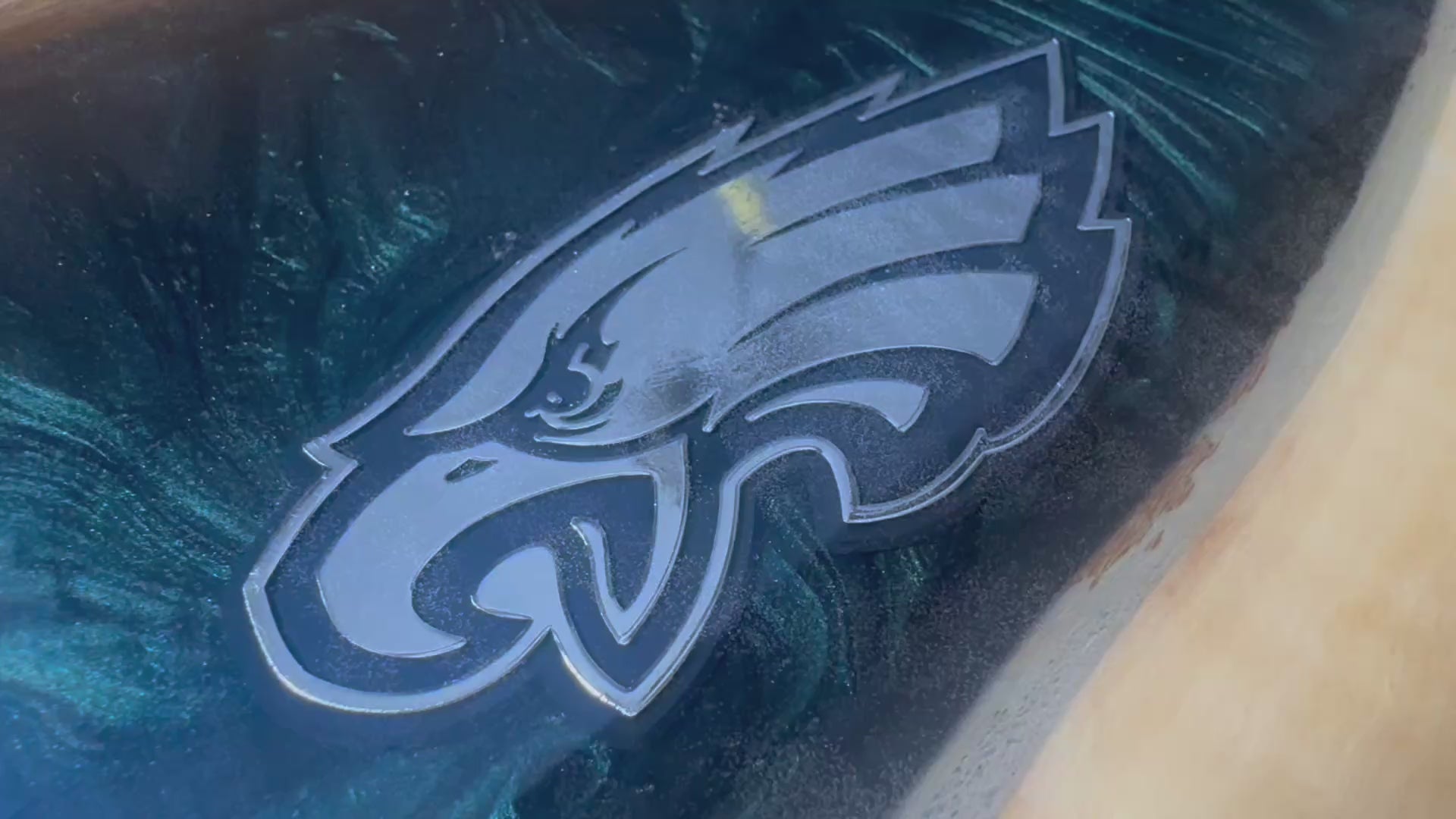 Elevate your game-day experience with this one-of-a-kind Philadelphia Eagles fan decor. Crafted from premium olive wood, this stunning live-edge board features bold black and green epoxy resin accents, perfectly capturing the spirit of the Eagles. The clear top coat of epoxy enhances its sleek finish while preserving the natural beauty of the wood grain. Measuring 22" long by 17" high, this unique piece makes a standout addition to any fan cave, living room, or sports memorabilia collection. Show off your team pride in style with this functional and artistic tribute to the Eagles