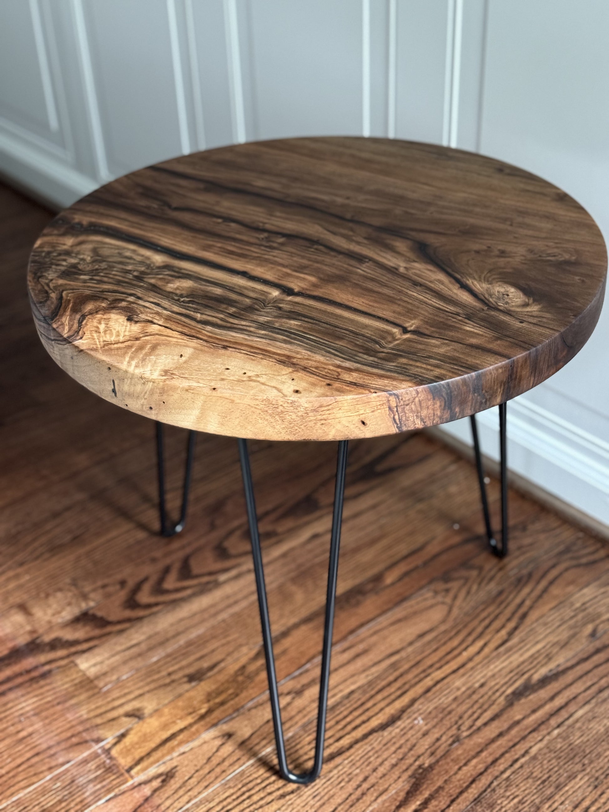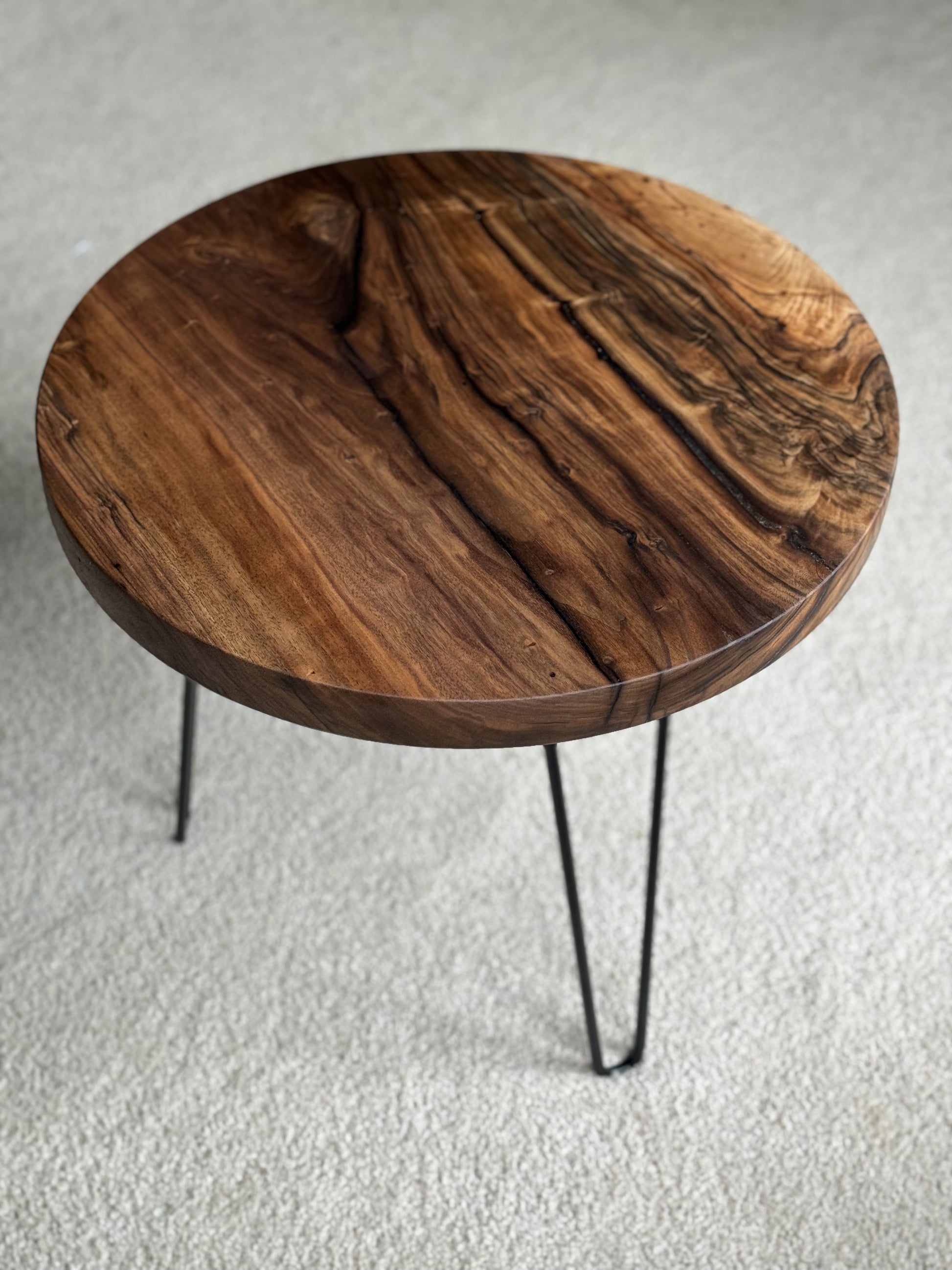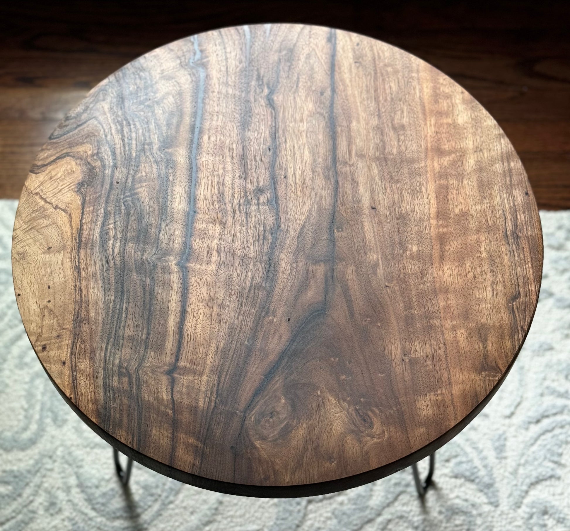 Introducing our exquisite English Walnut End Table, meticulously crafted to elevate any space. With sleek hairpin legs providing stability and style, this table boasts a diameter of 20 inches and stands at a height of 18 inches, making it perfect for any corner or beside your favorite seating area. The mesmerizing grain of English walnut steals the spotlight, while the carefully curated finish enhances its natural allure. Add a touch of sophistication to your décor with this stunning piece of furniture.