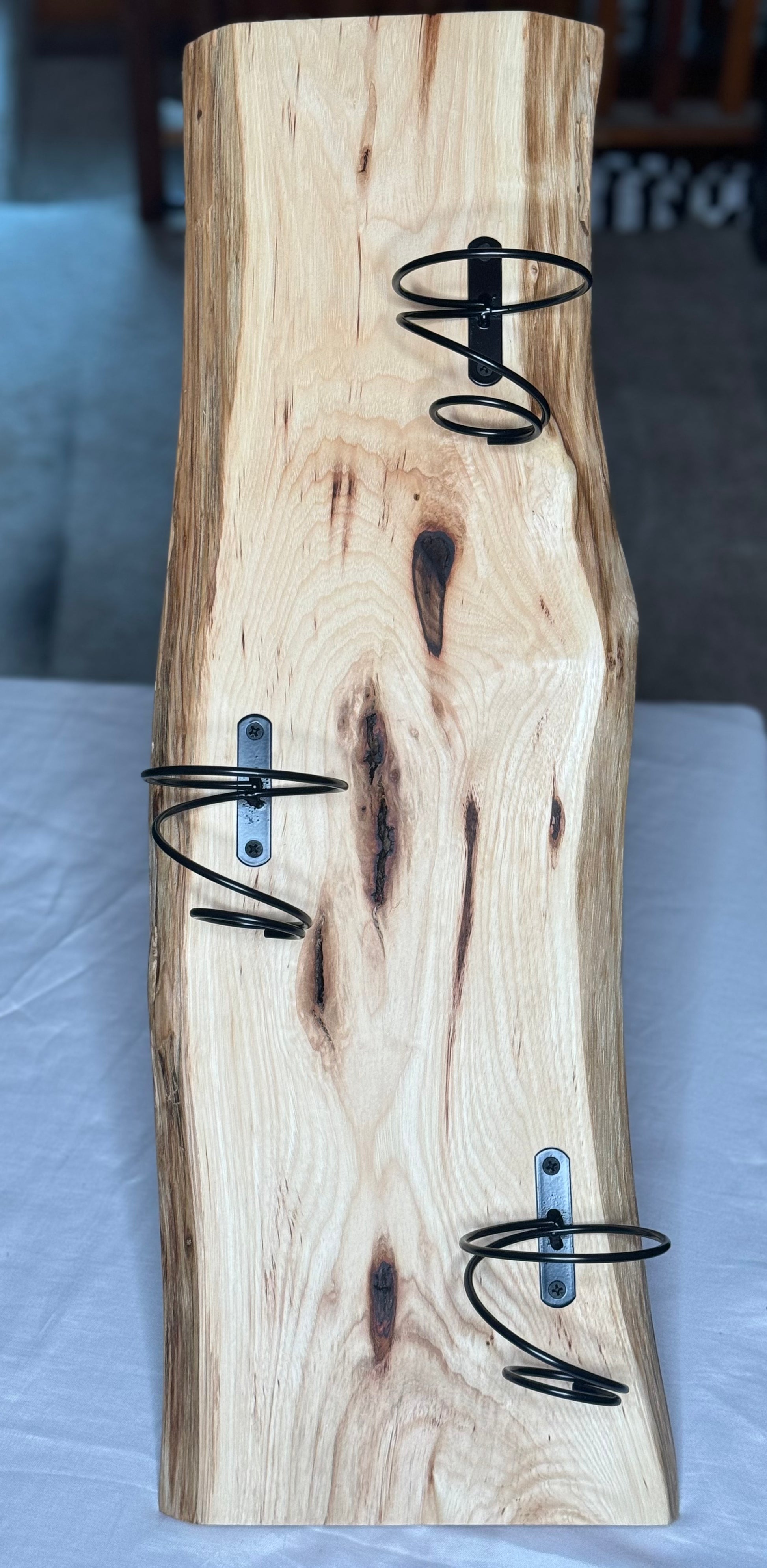 Hand crafted wine bottle holder. Crafted with elegance this 3 bottle wine holder is made out of live edge Hickory finished off with a natural wood oil that will keep bringing compliments from guests for years to come. Piece is 27” in height and ranges from 9-10” wide.